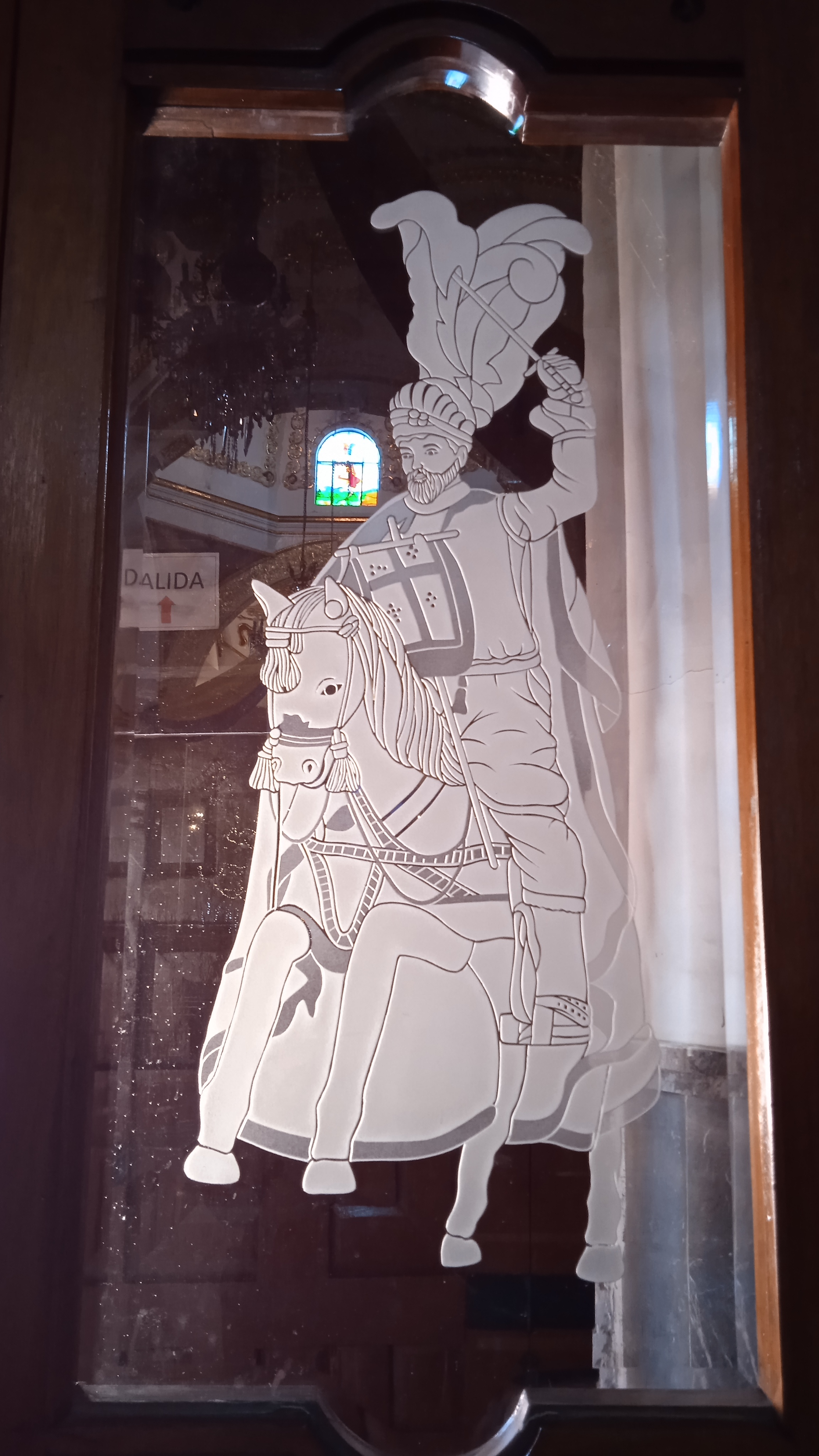 En el tercer cuerpo de la fachada hay un alto relieve de factura reciente en colores azul y blanco, que representa a Santiago a caballo enfrentándose a los moros. La composición de la escena recuerda las populares estampas de Santiago que se venden en los mercados y en los pórticos de las iglesias. En lo alto de la torre están esculpidos dos escudos: el primero es heráldico, cardenalicio, según los pisos de la borla que lo rodean. Se trataría del escudo de un cardenal sevillano, protector de la orden franciscana en la época en que se construyó la iglesia. En el fondo del escudo se representan las cinco llagas franciscanas. El segundo escudo contiene el monograma de la virgen María, representado por las letras MR entrelazadas, rematadas por una corona de reina. La presencia de la Virgen en las iglesias de Santiago no es un hecho esporádico, sino constante, según hemos podido constatar.