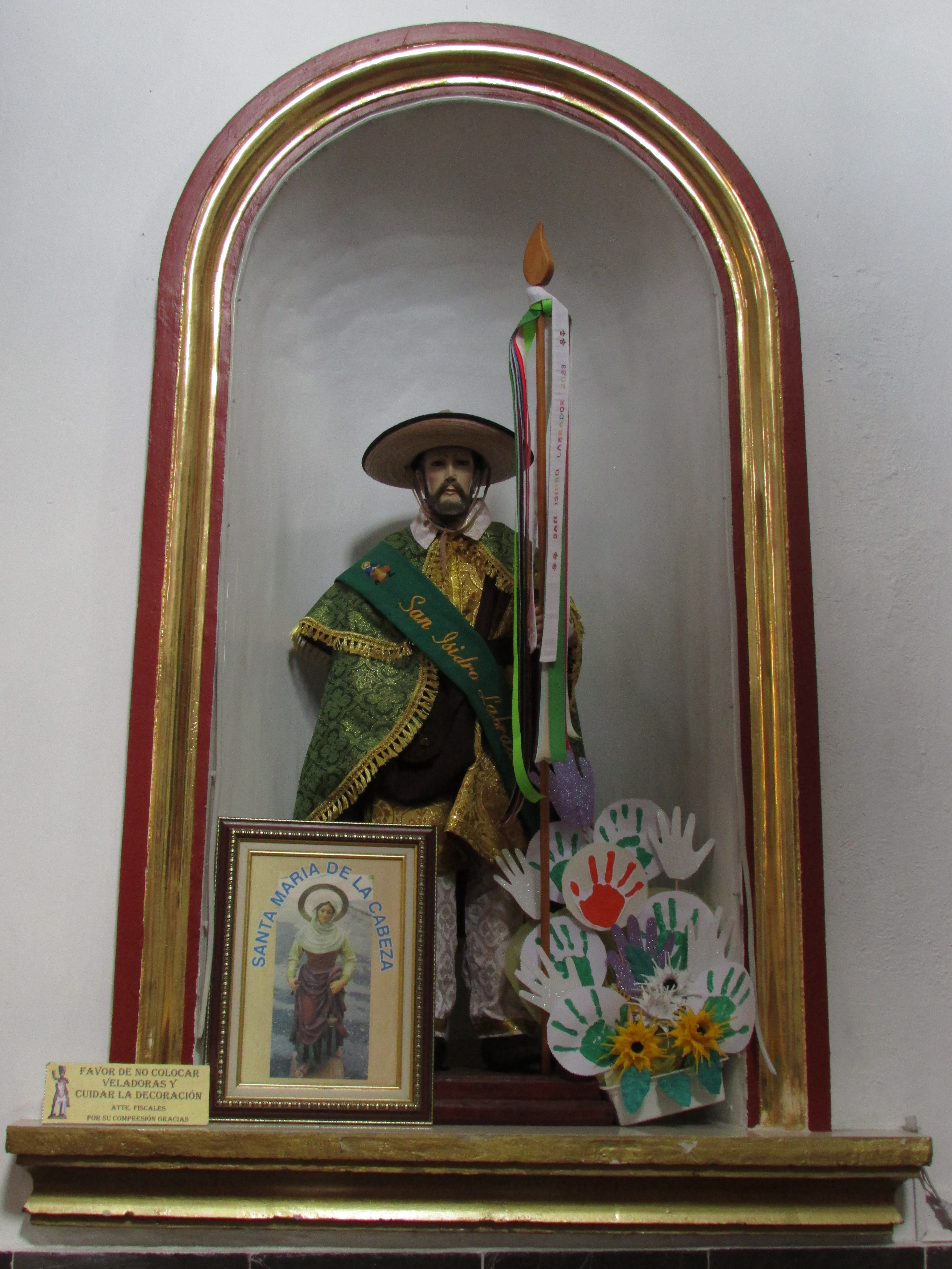 Al parecer, el templo no conserva ninguna imagen antigua del Apóstol. Según el párroco, la parroquia fue quemada por los zapatistas, cuando en la Revolución Mexicana ocuparon el pueblo. Actualmente se veneran dos imágenes: una de peregrino en el altar mayor y otra ecuestre, procesional, dentro de una capilla, en el fondo de la iglesia. Ésta es la imagen más venerada. Santiago figura como un hombre esbelto; viste una armadura verde adornada con hermosos querubines dorados que están en cada coyuntura de las rodillas y los codos; en las piernas corre un tallo dorado. Este elegante caballero, lleva un casco con un plumón colorido. Su montura es apacible e inocente, sin belicosidad alguna.
