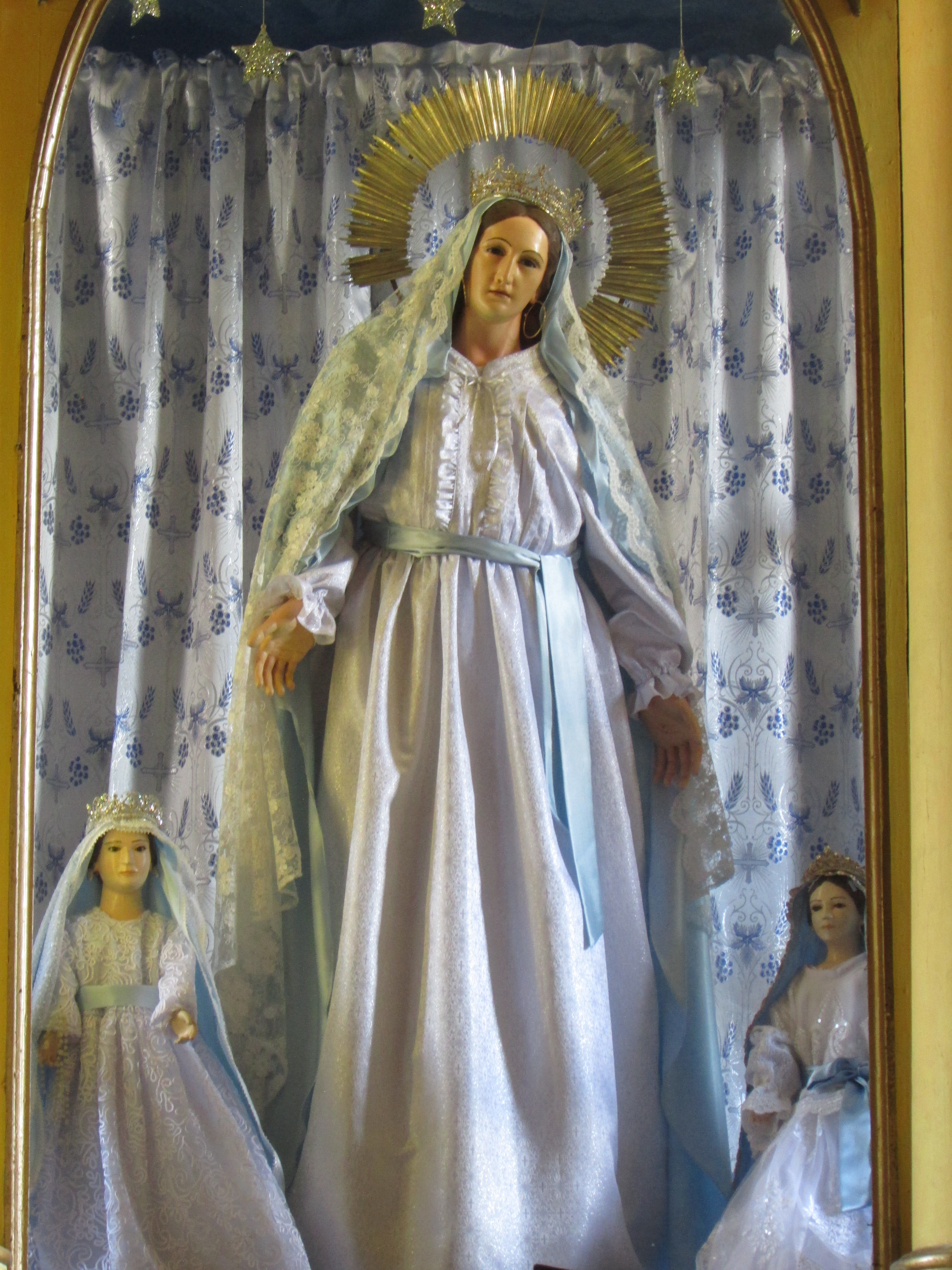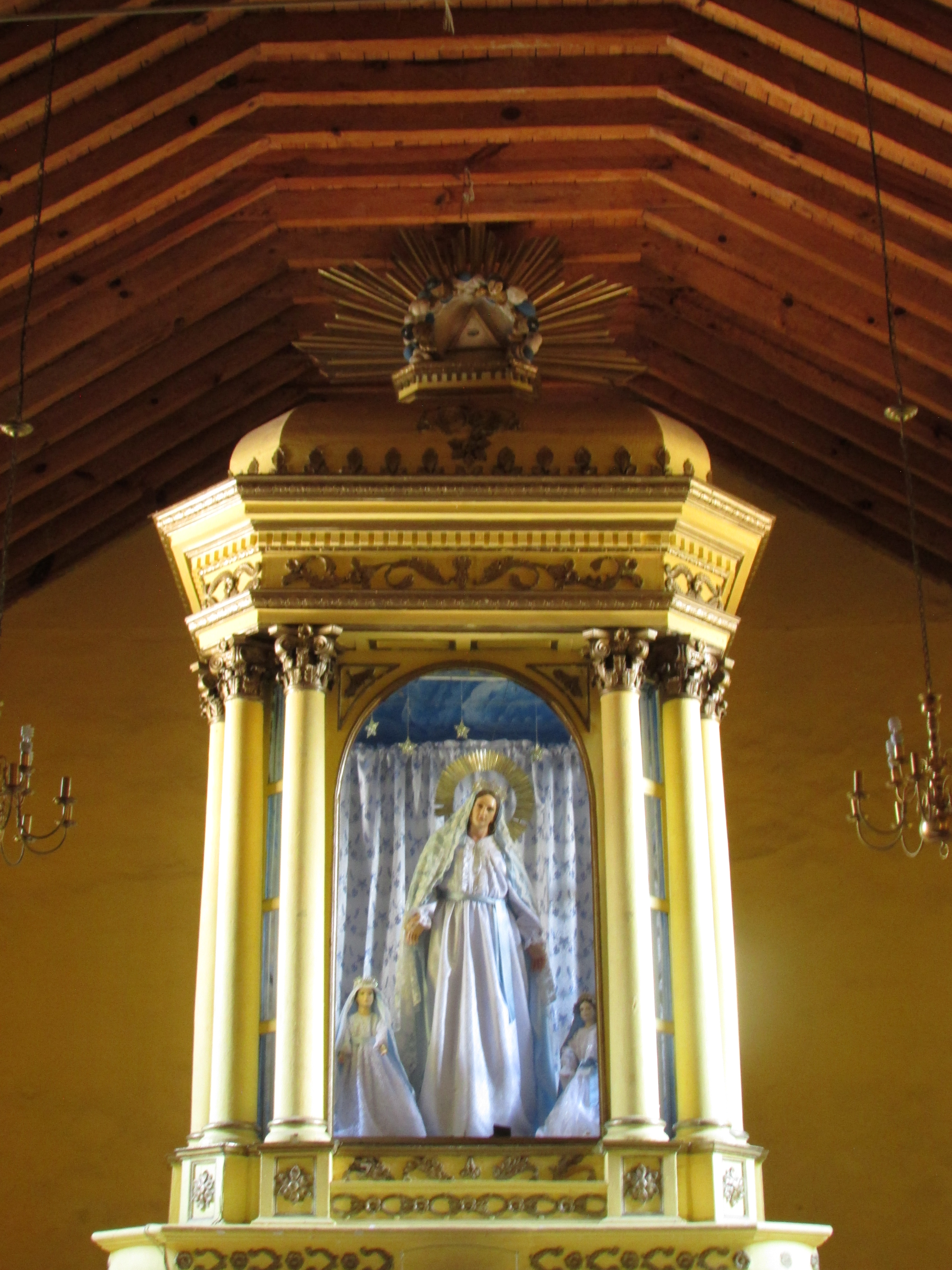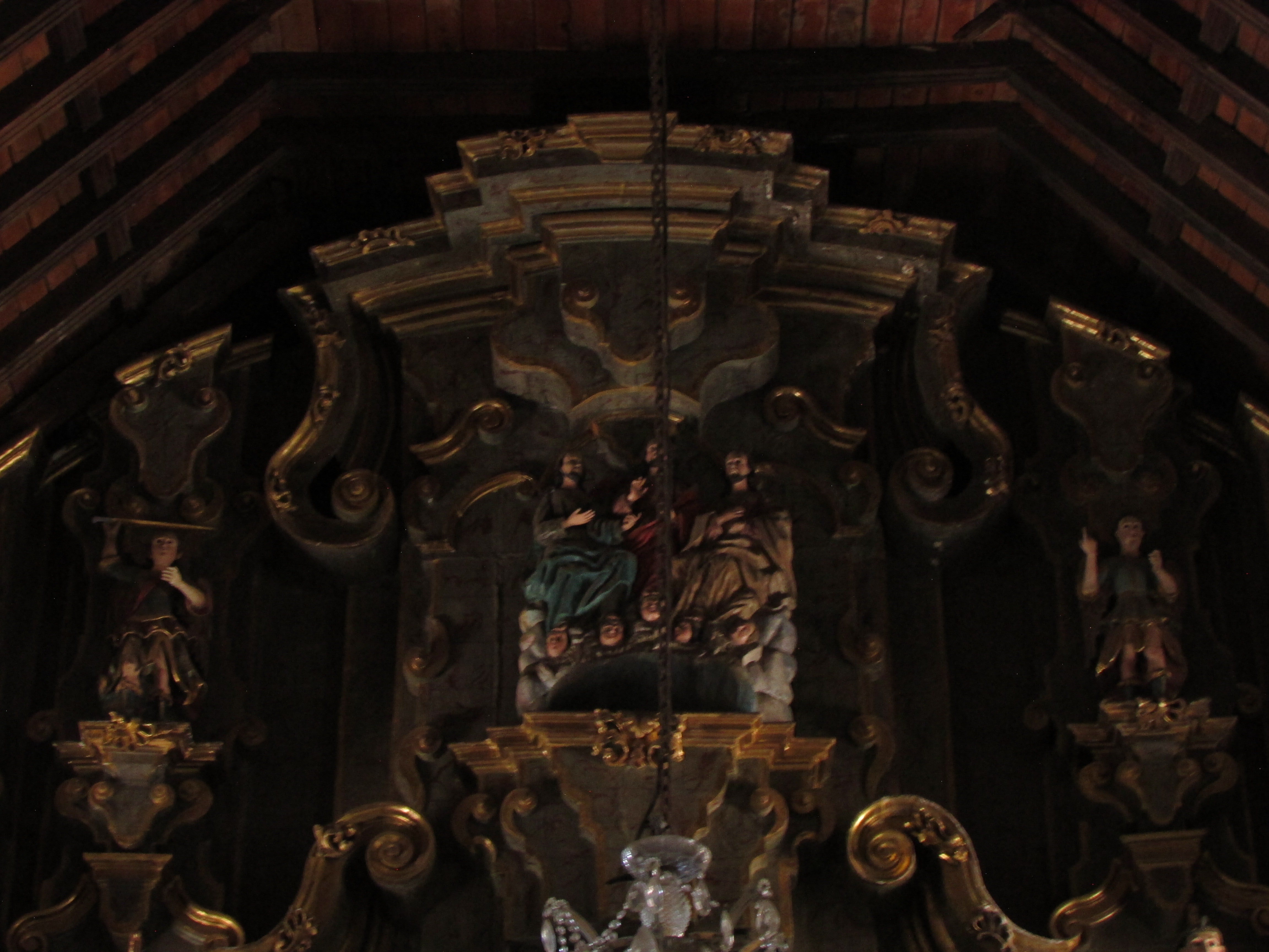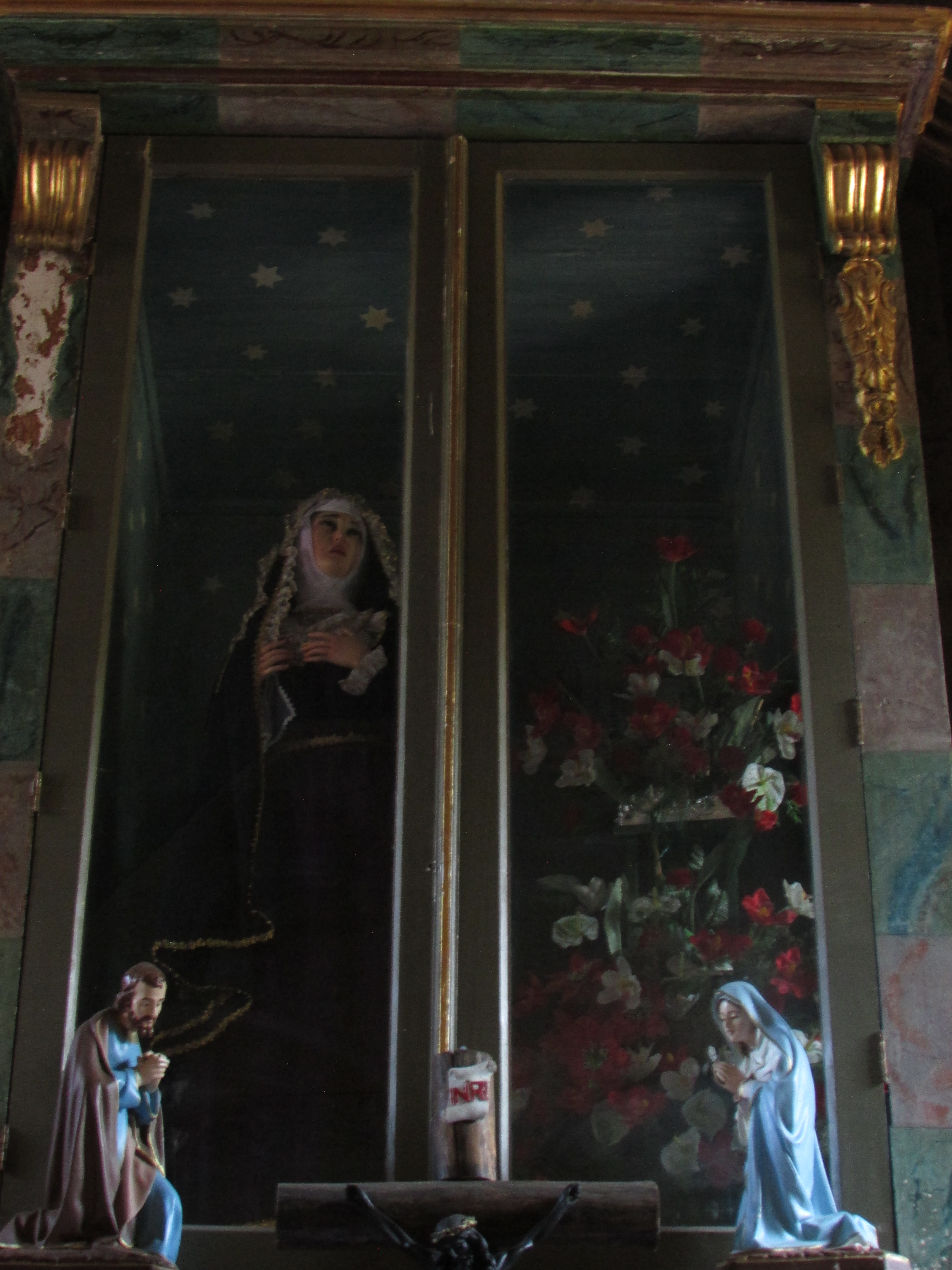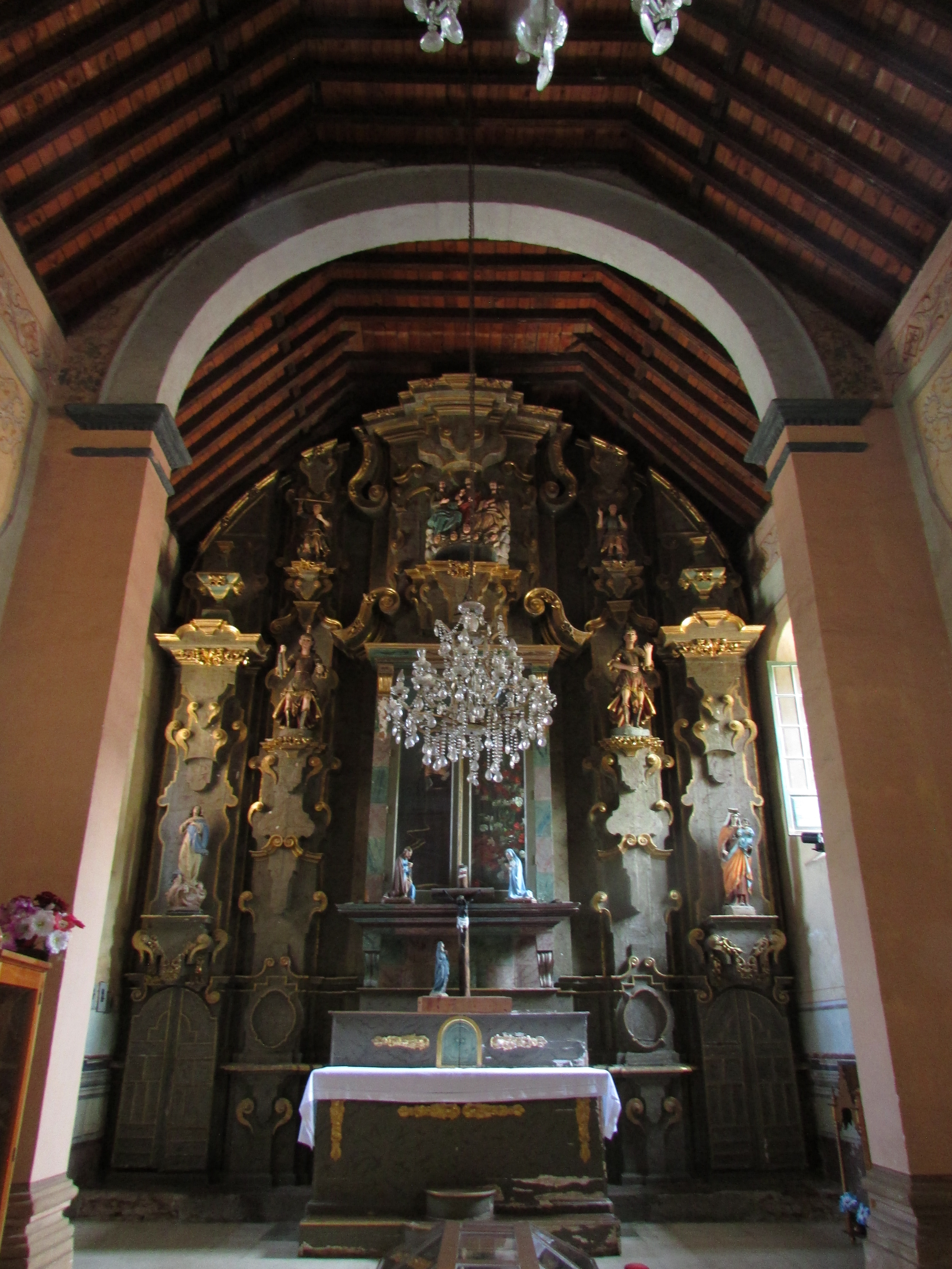 Aparece en el extremo lateral, ante nosotros, el que es uno de los tesoros mejor guardados de este templo, la capilla lateral, que presenta un interesante retablo barroco, en el sentido de que su aspecto hace suponer dos cosas: o nunca fue terminado, o el tiempo lo dañó y hubo de ser intervenido, aunque de un modo poco adecuado. En cualquiera de los dos escenarios, afortunadamente se conserva. Vemos unos ángeles, seguramente por su iconografía arcángeles. Un Cristo yacente en su urna (acaso articulado). Y el remate del retablo, una Trinidad pero con las tres personas presentando los mismos rasgos. Los colores de sus ropajes son los que permiten determinar quien es quien en dicha jerarquía.
