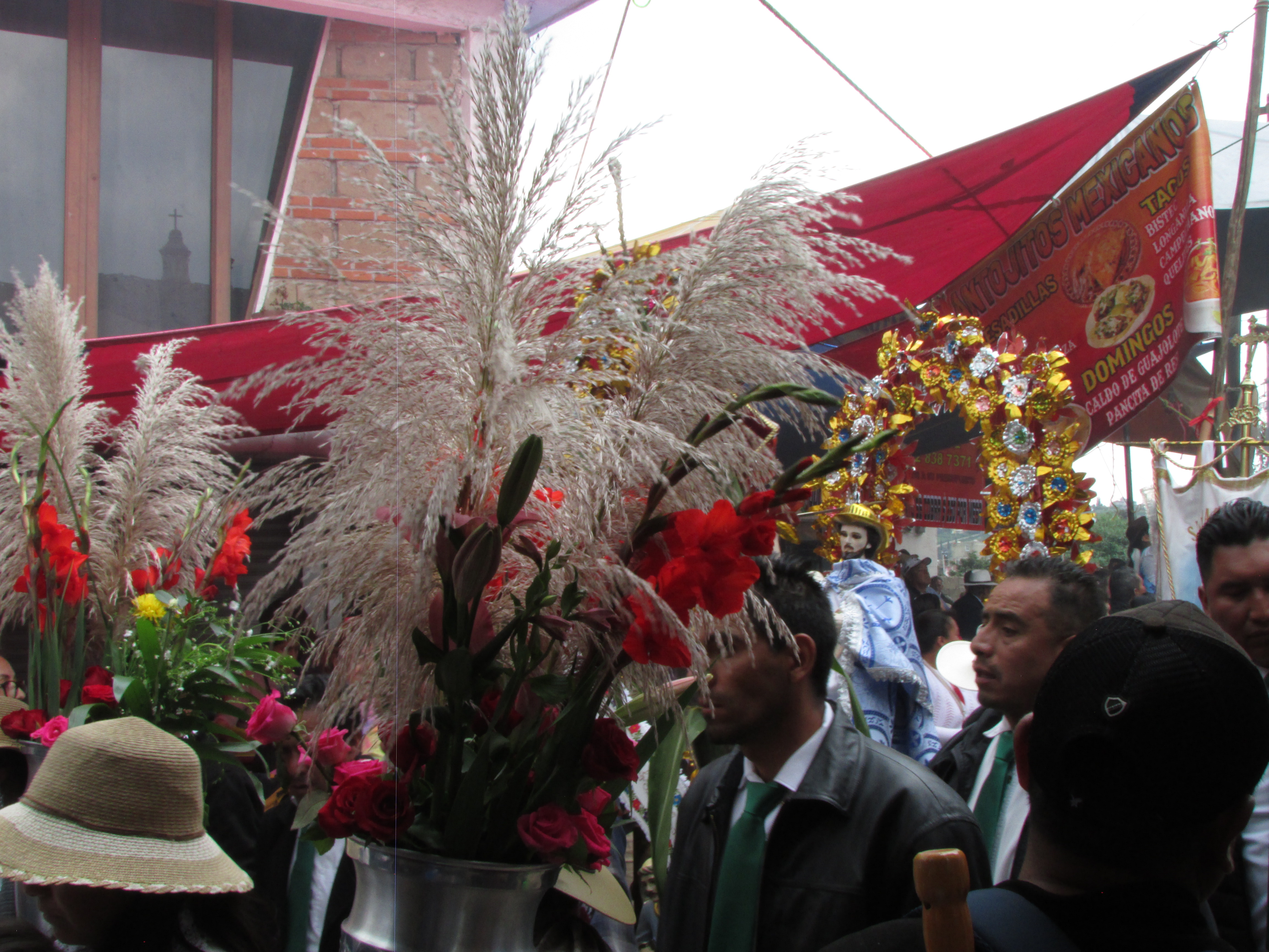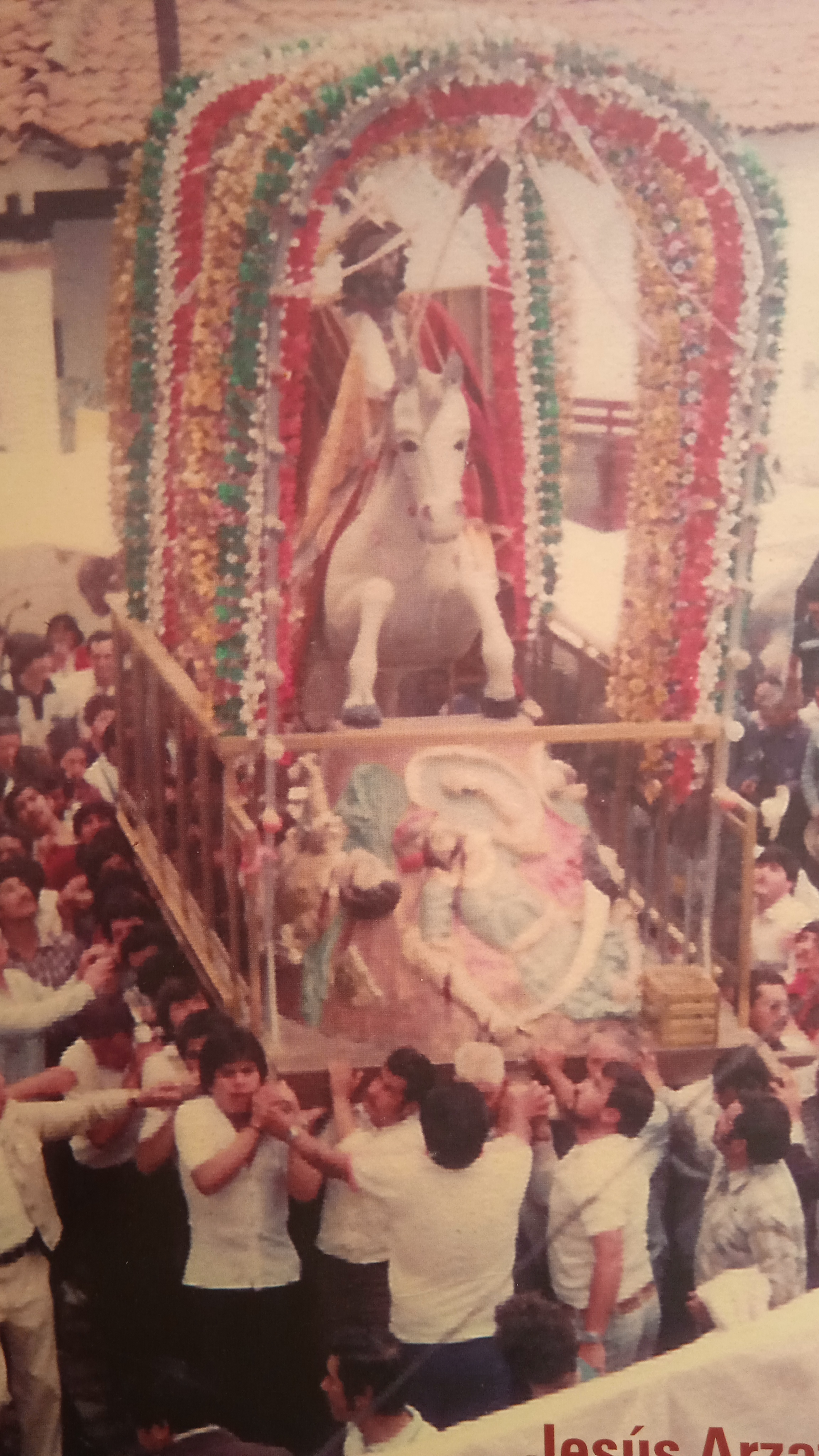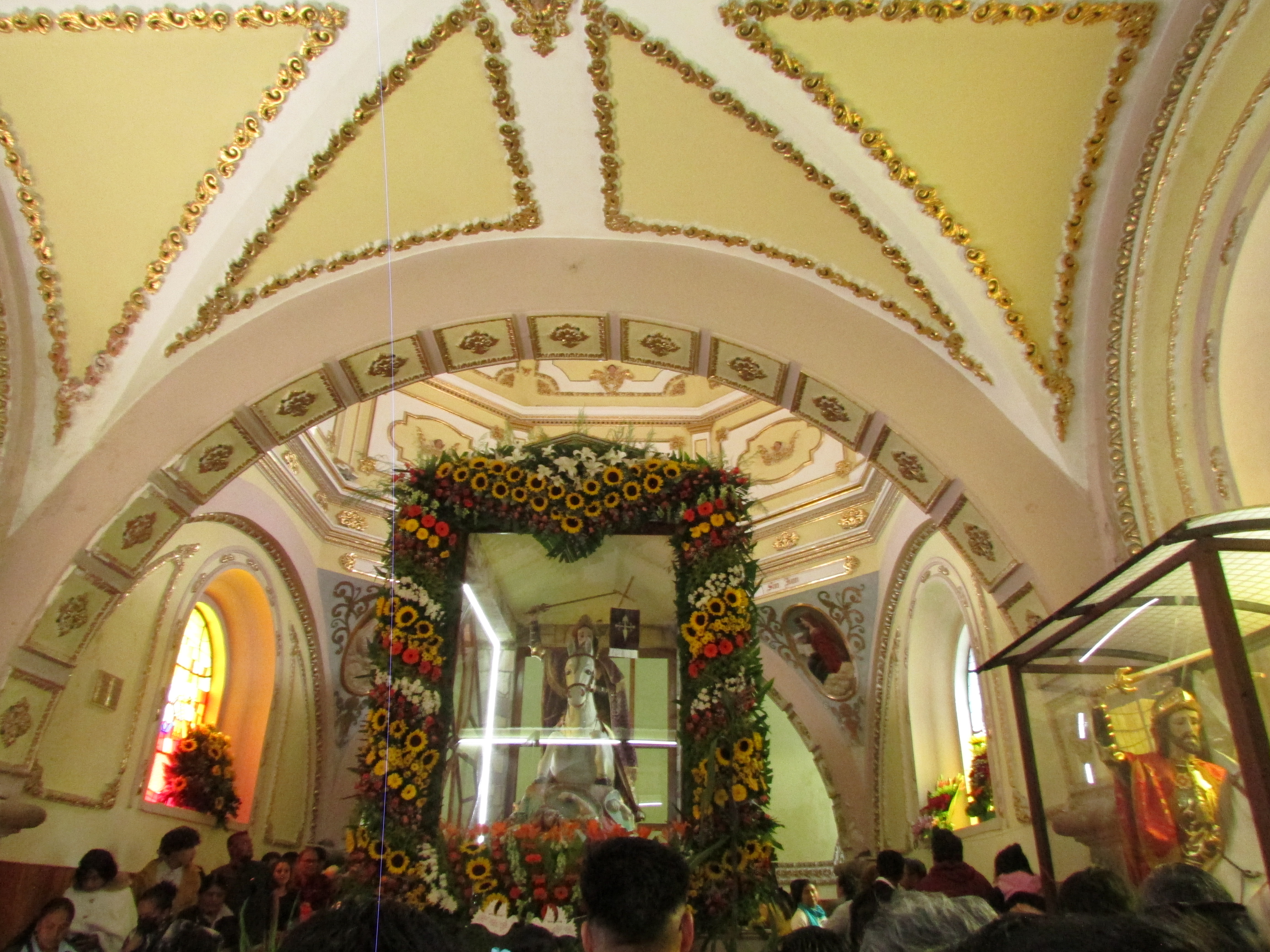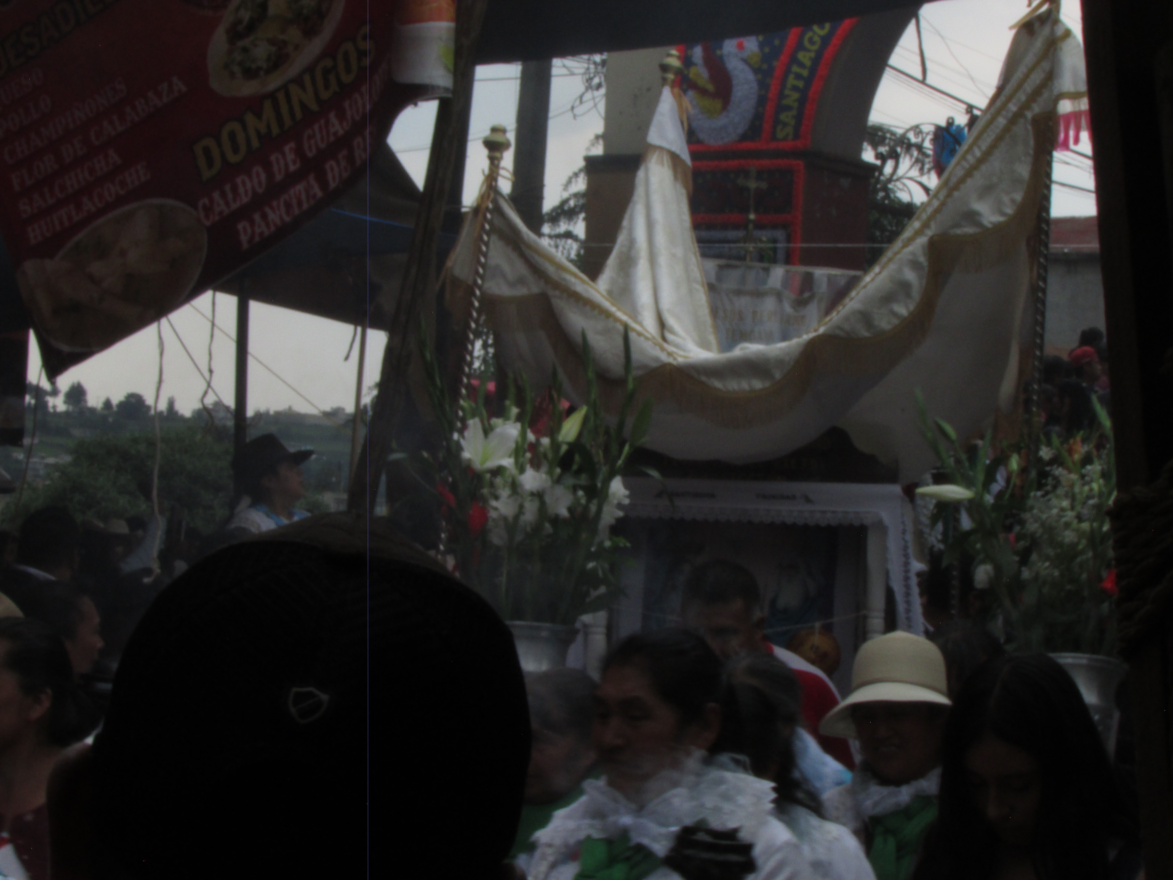 La fiesta del Señor Santiago reúne a todas las comunidades del municipio durante dos semanas a partir de la víspera de la fiesta titular. Desde temprano los vecinos de las comunidades salen en procesión desde sus iglesias para traer las imágenes de los santos patronos para visitar al Señor Santiago en su santuario. Cada comunidad trae en andas de madera, con sus nichos o altarcitos, a su santo patrono, vestido y adornado para la fiesta con flores, dulces, panes frutas, palomas de azúcar, cañas, etcétera. Los acompañan sus músicos con violín, guitarra y tambor.