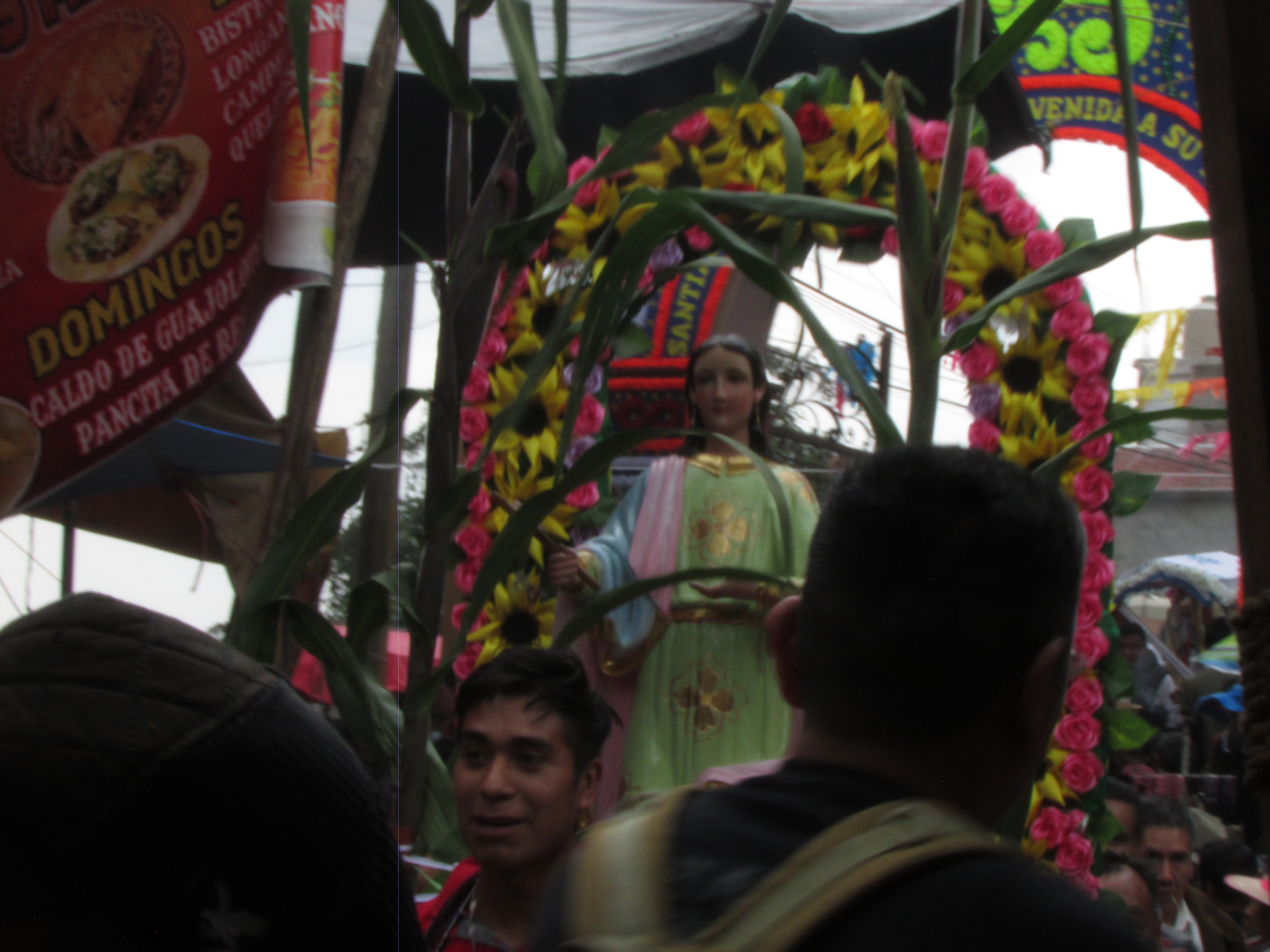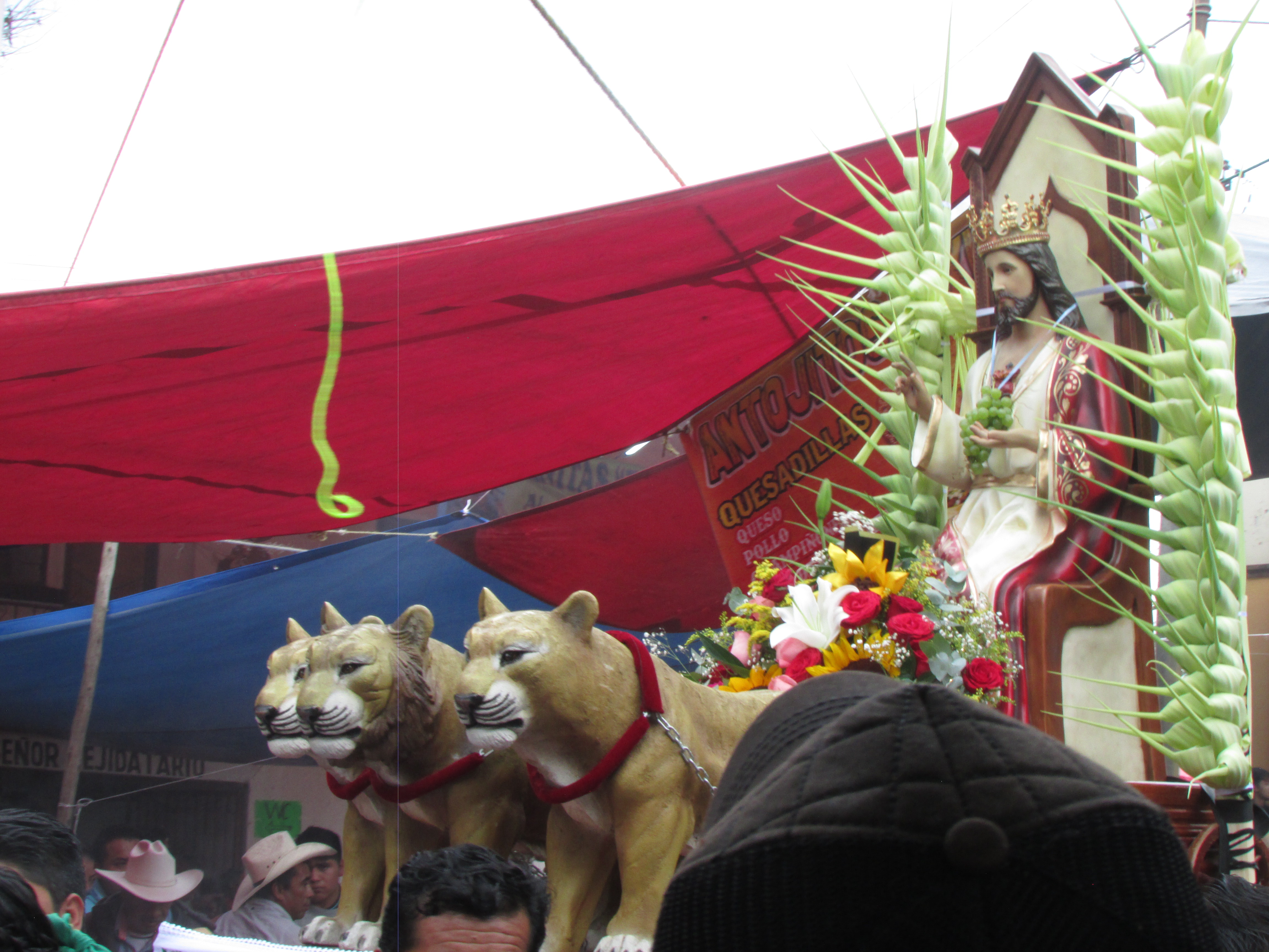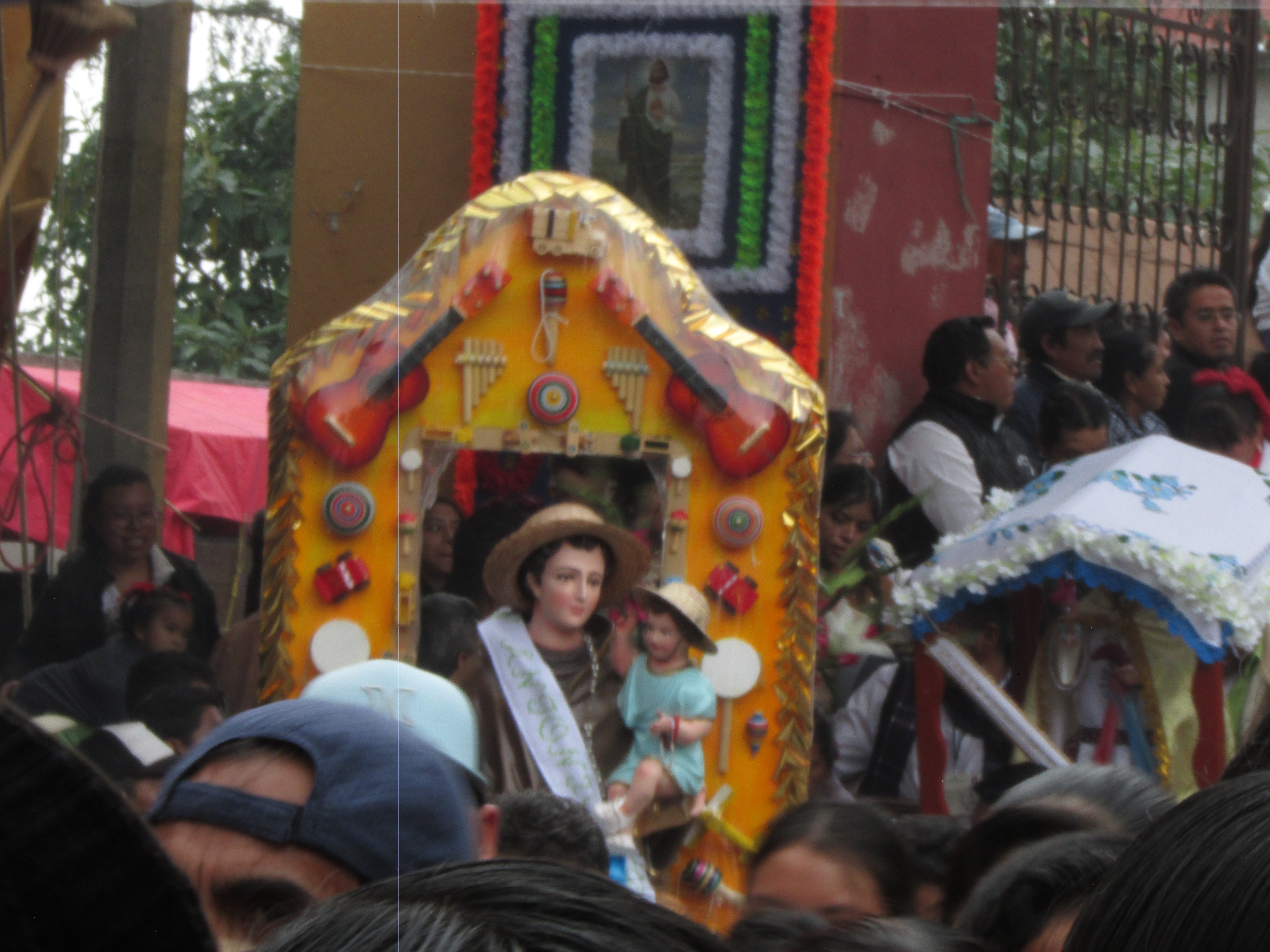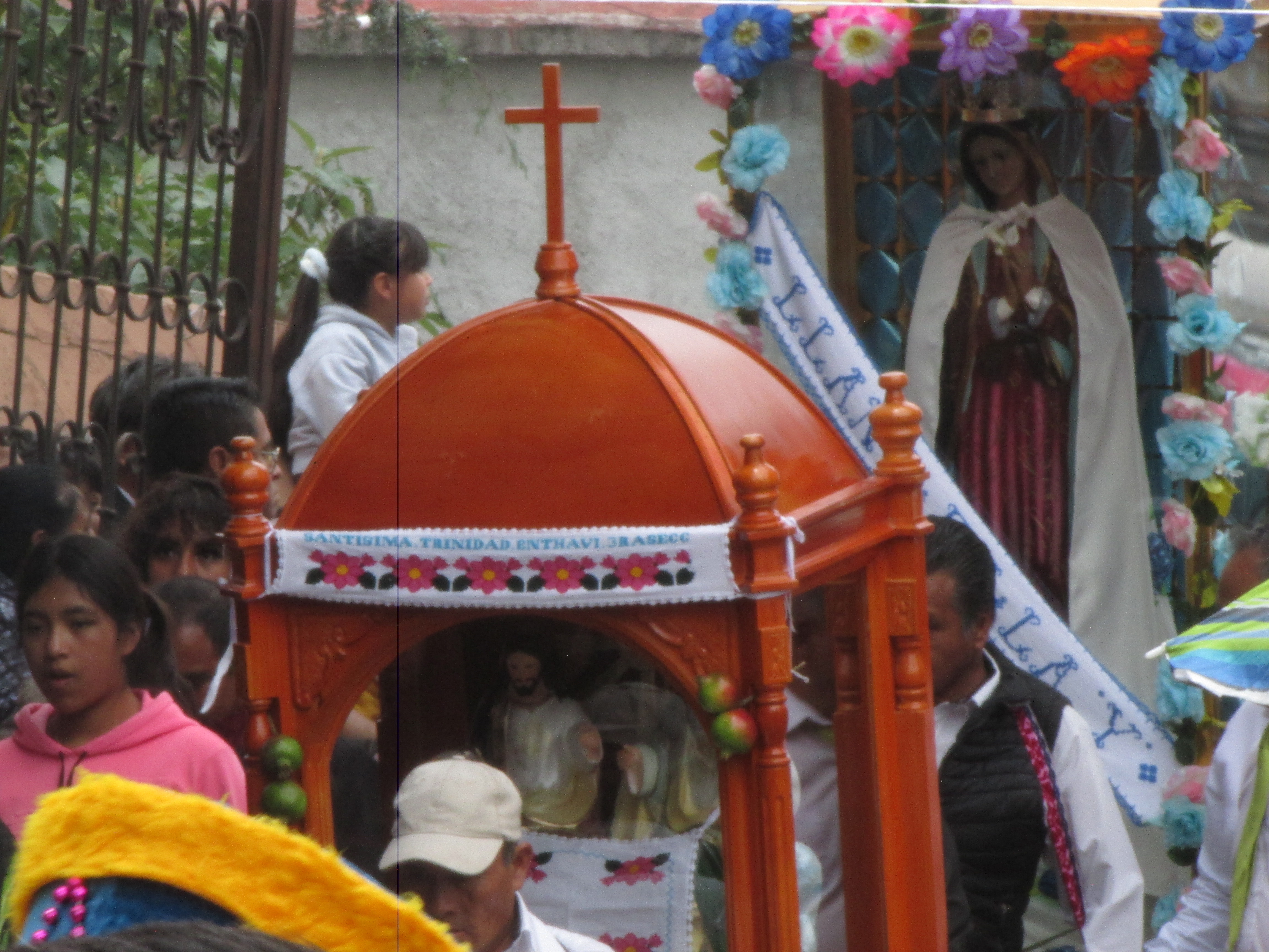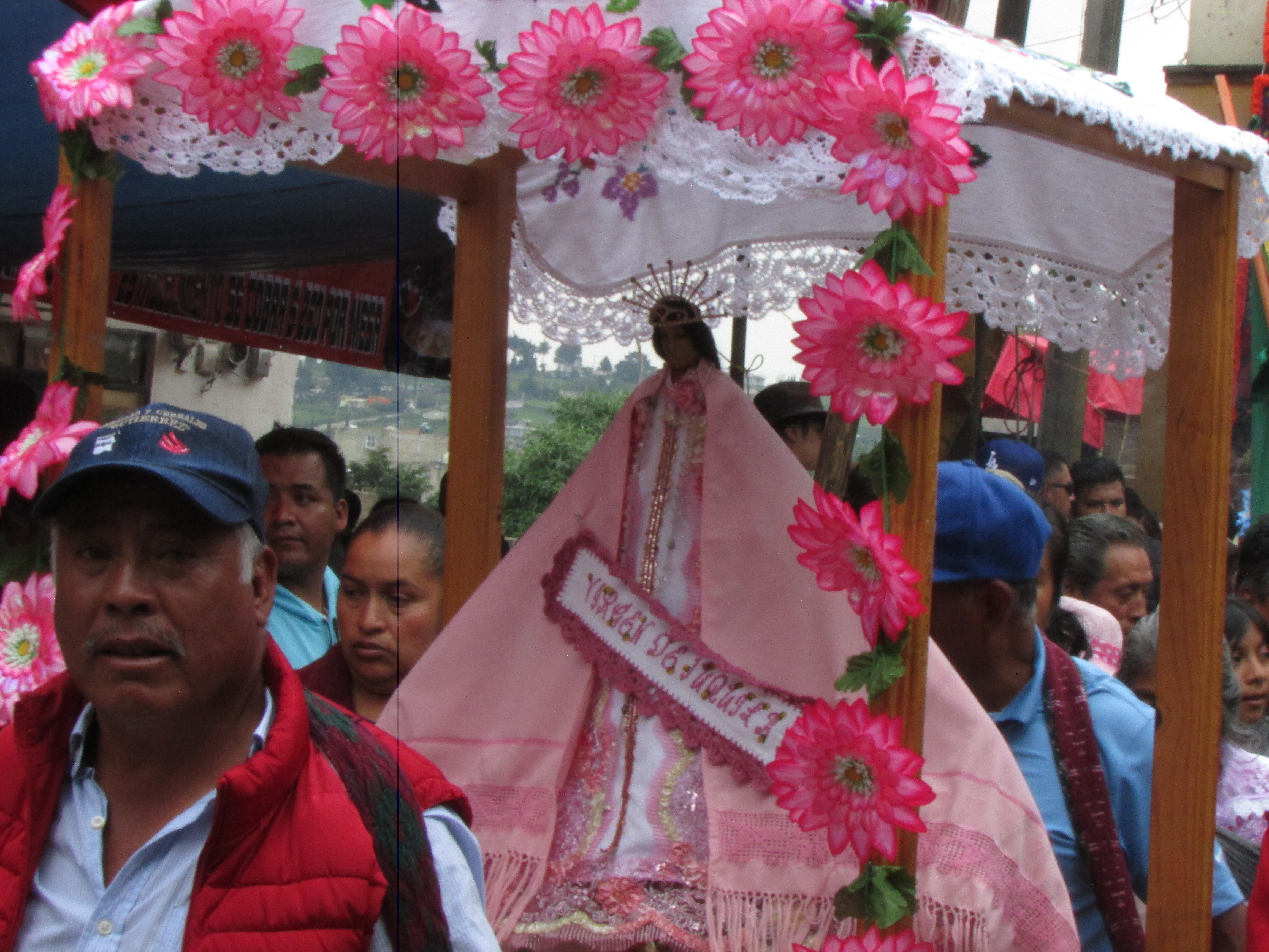 La fiesta del Señor Santiago reúne a todas las comunidades del municipio durante dos semanas a partir de la víspera de la fiesta titular. Desde temprano los vecinos de las comunidades salen en procesión desde sus iglesias para traer las imágenes de los santos patronos para visitar al Señor Santiago en su santuario. Cada comunidad trae en andas de madera, con sus nichos o altarcitos, a su santo patrono, vestido y adornado para la fiesta con flores, dulces, panes frutas, palomas de azúcar, cañas, etcétera. Los acompañan sus músicos con violín, guitarra y tambor.