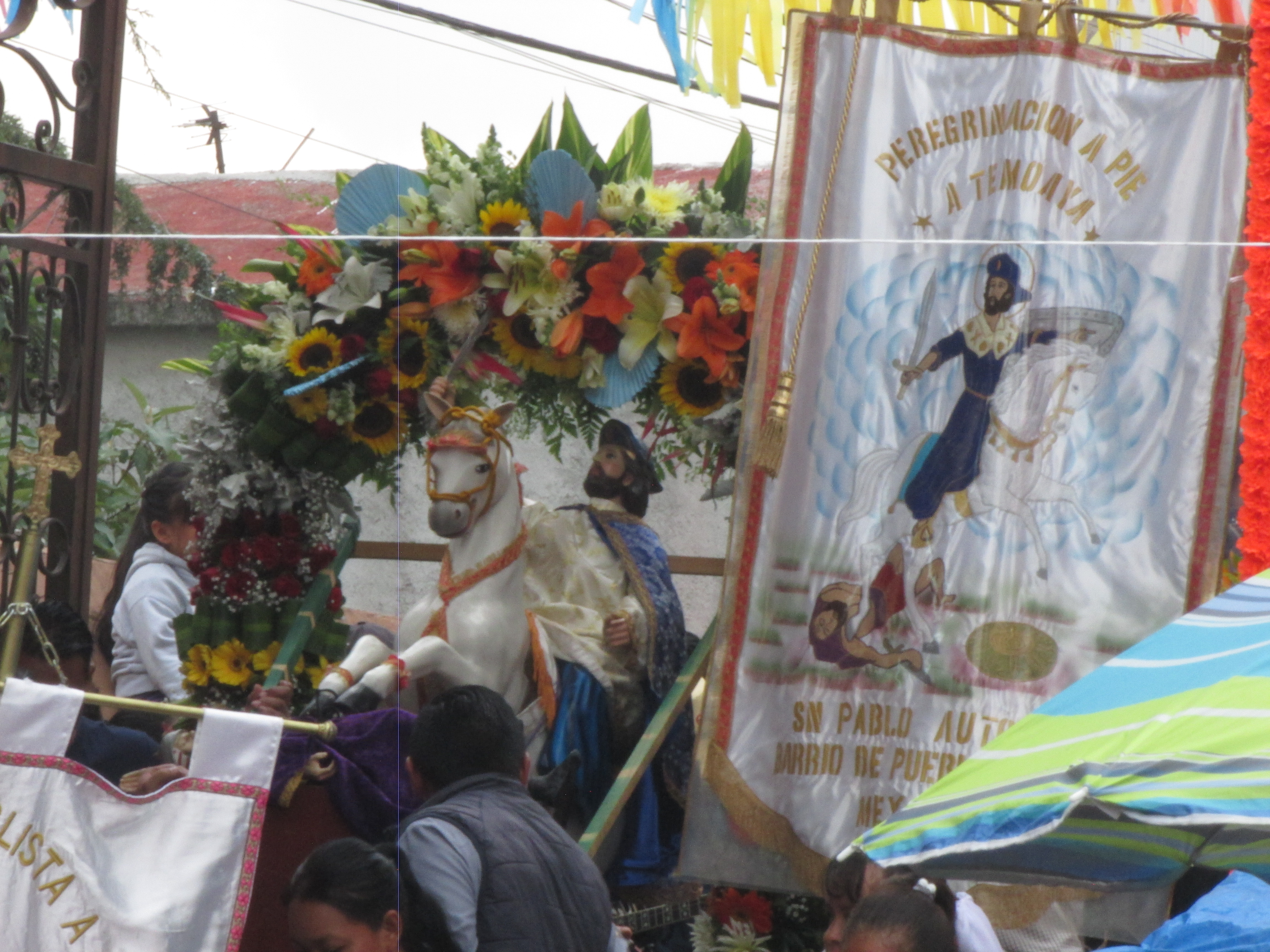 El origen de la fiesta más importante de Temoaya, dedicada al Apóstol Santiago, es casi tan antiguo como la religión católica en esta tierra. En las primeras décadas del siglo XVII la imagen ecuestre del Señor Santiago fue llevada a Temoaya, que buscaba convertirse en cabecera. Para entonces ya permeaban en la mente de los feligreses diversas leyendas y noticias sobre la actuación milagrosa de Santiago a favor de la población local.