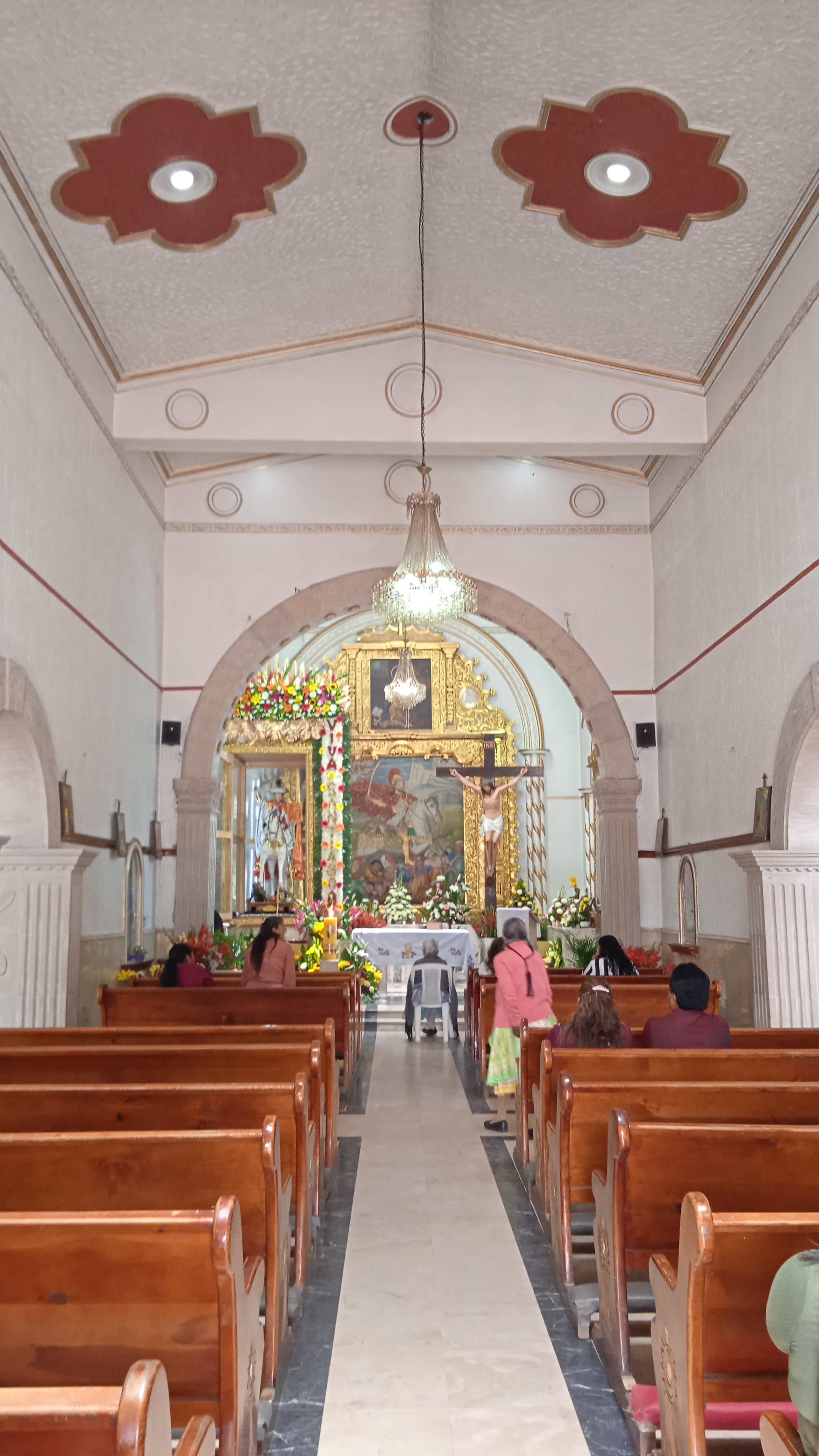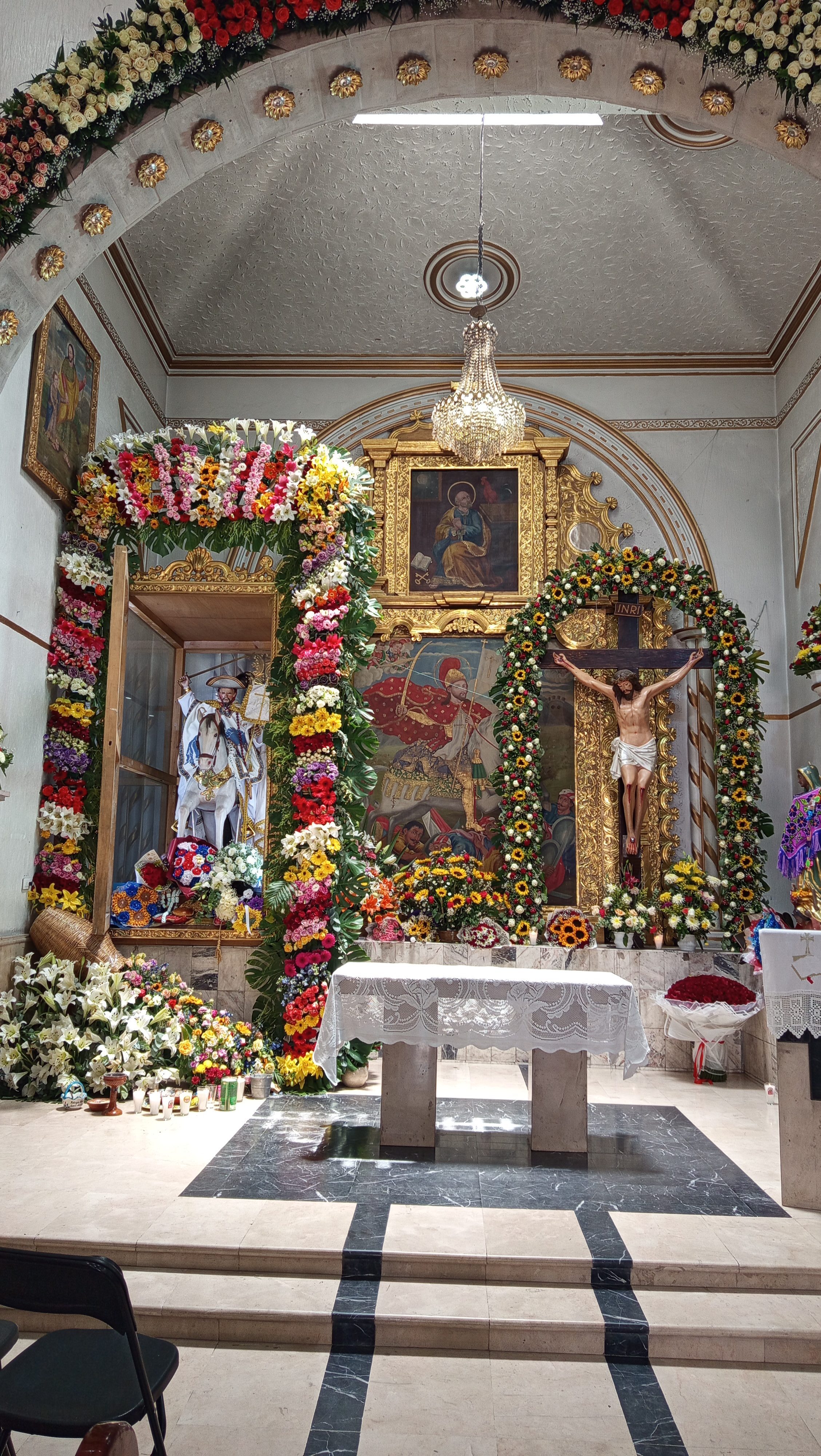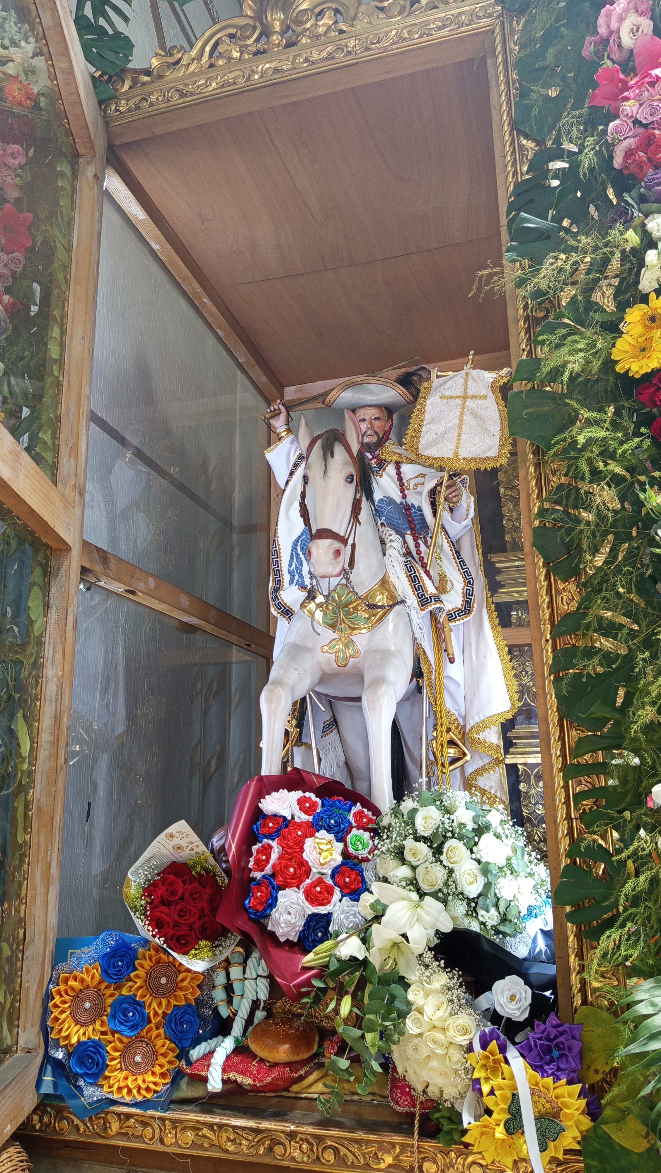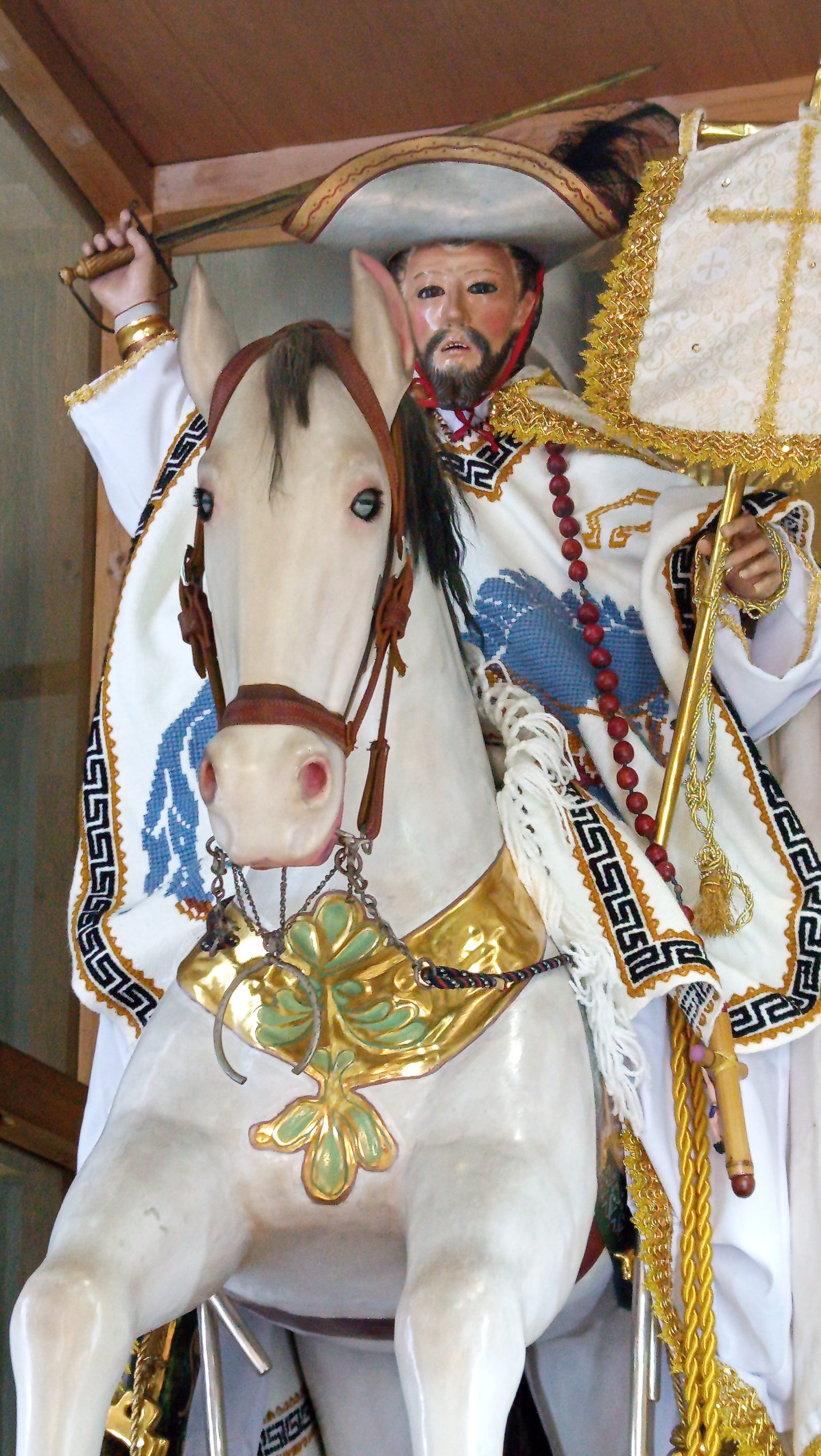 La efigie de Santiago Matamoros es una escultura de tamaño cercano al natural, anónimo como la mayoría de imágenes de la época. Aunque tiene rasgos semejantes a los de otras poblaciones cercanas, en particular, las de Santiago Yeche, Santiago Acutzilapan y Santiaguito Maxdá, a su vez hay algunas características que lo alejan un tanto de estos tres ejemplos, como el sombrero esculpido, los moros bajo del caballo, y el rostro mismo del apóstol, donde alcanzan a apreciarse ligeramente los dientes, algo inusual en otras imágenes de este santo en la región, incluso de otras no tan semejantes a la de los poblados ya mencionados. Los lienzos que componen el retablo parecen haber sido hechos por algún pintor local, siendo aventurado todavía poder señalar la autoria, aunque por el colorido recuerdan un tanto la obra del pintor atlacomulquense José Vicente Montiel, sin embargo, esta afirmación tampoco puede ser concluyente.