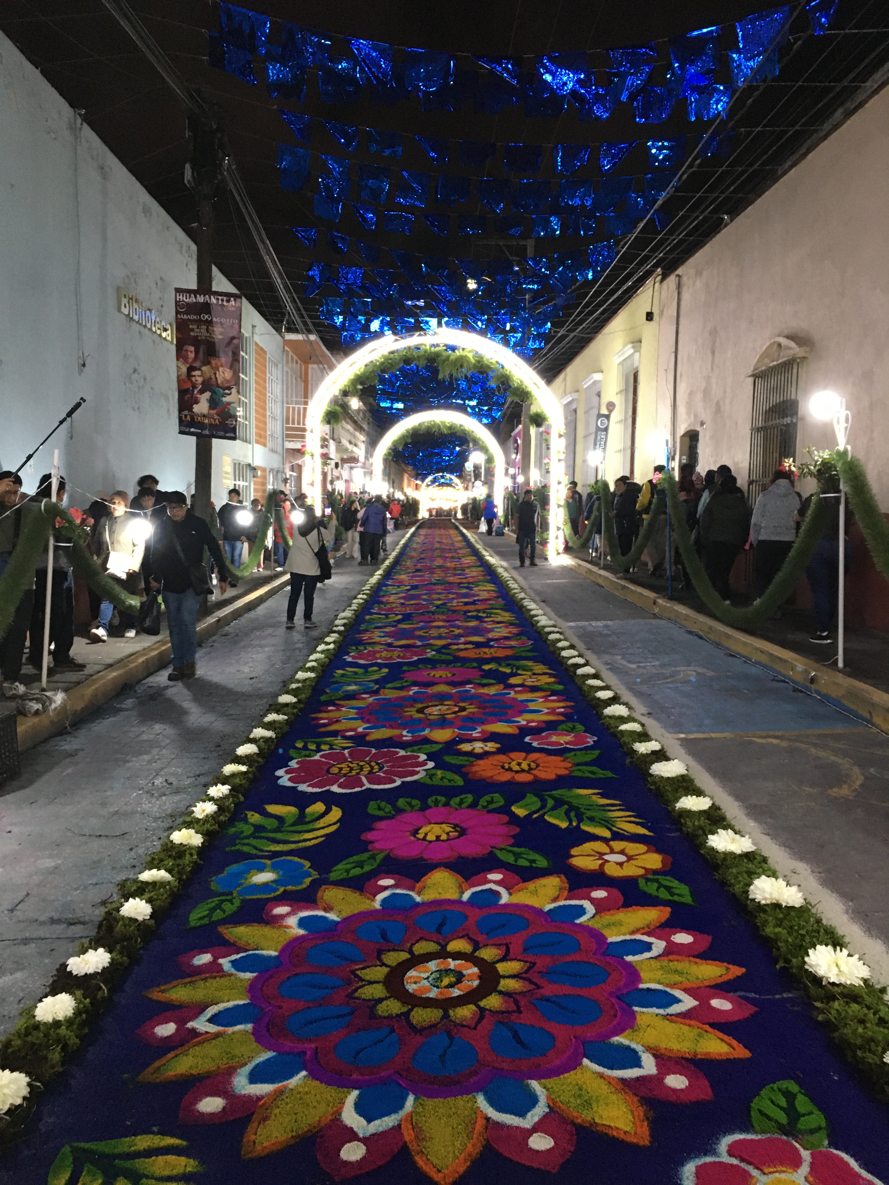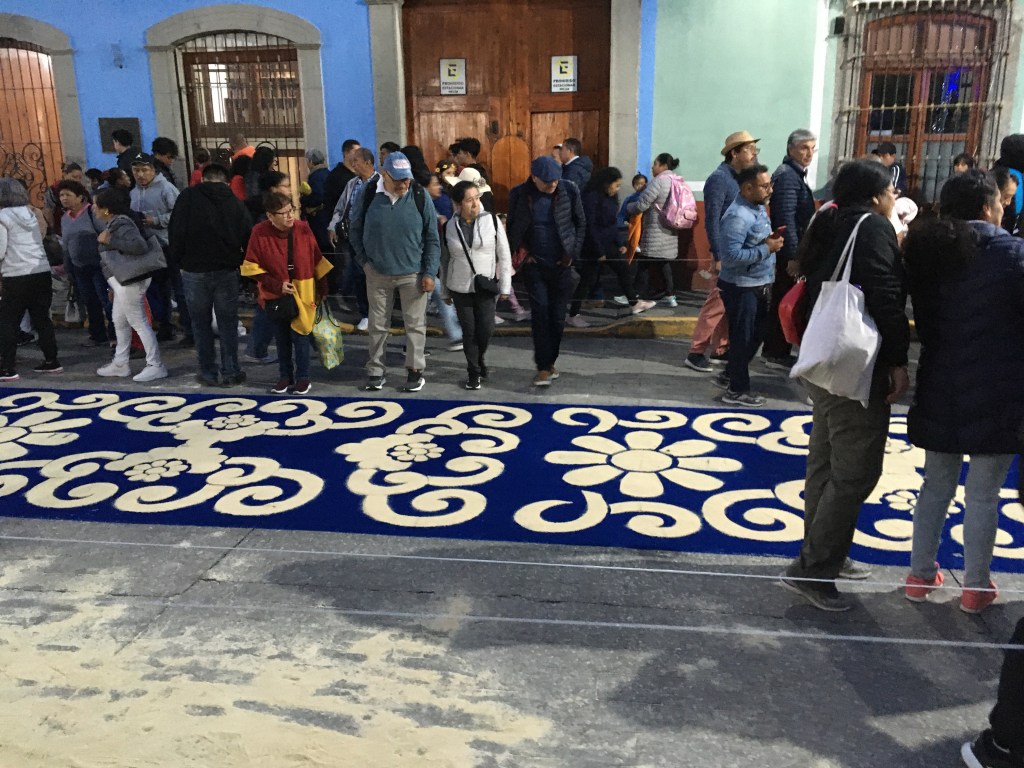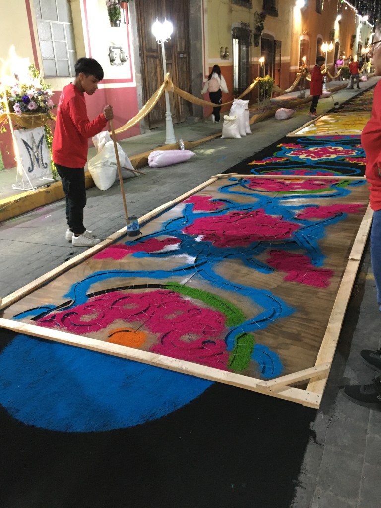 La mayor labor se ejecuta en las primeras calles donde discurre la procesión, pues todavía a las tres de la mañana es posible ver a los vecinos de otras calles elaborar los tapetes, a pesar de ya haber salido la procesión desde instantes previos, evidentemente estas serán las últimas calles en que avanzará el cortejo. Por último, no se puede pasar por alto la ofrenda musical que ofrece en la plaza de armas el artista Carlos Rivera, originario de Huamantla, quien encabeza otro de los grandes momentos esperados por propios y extraños.