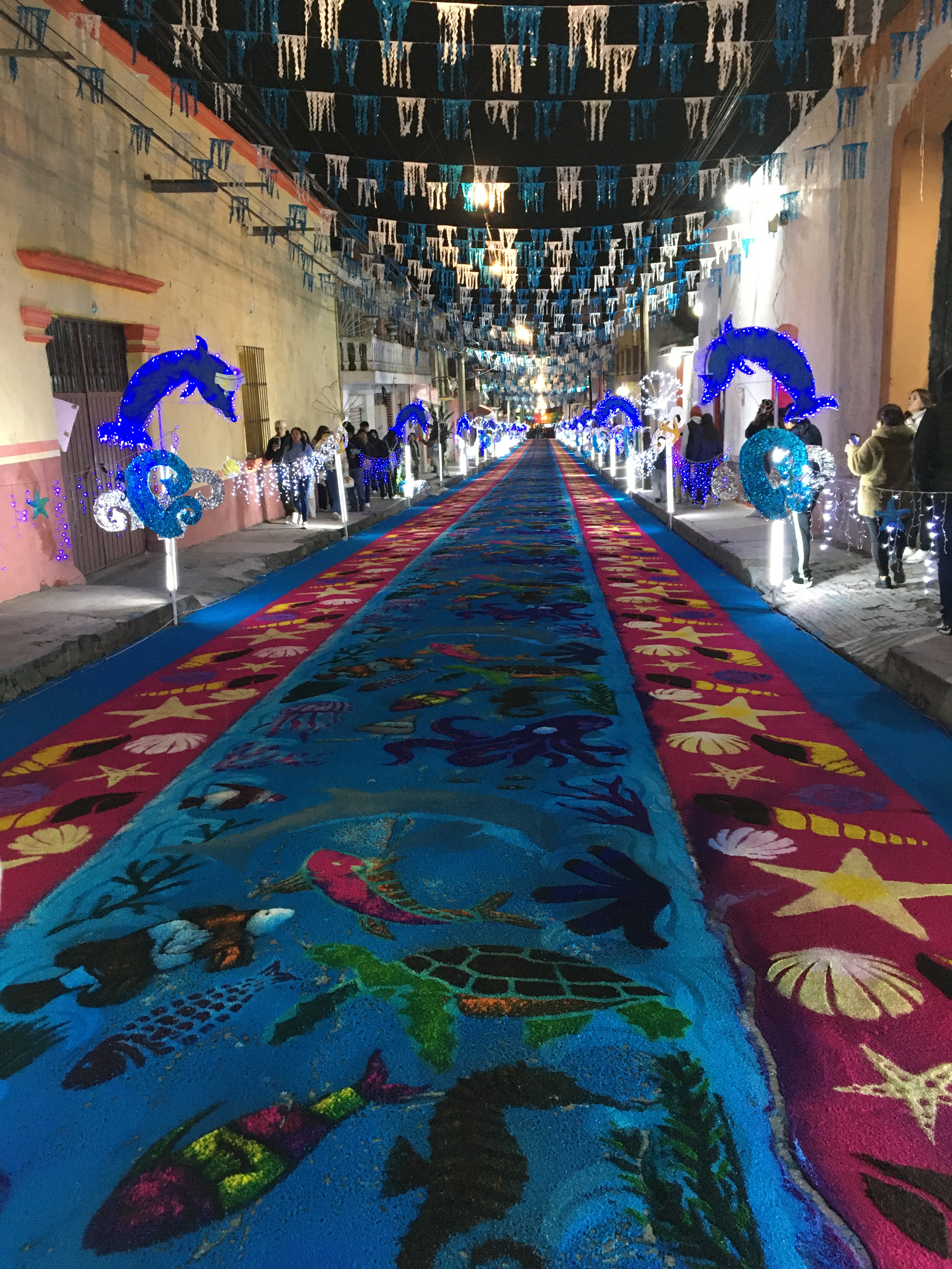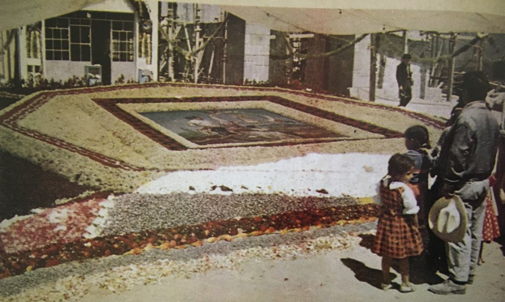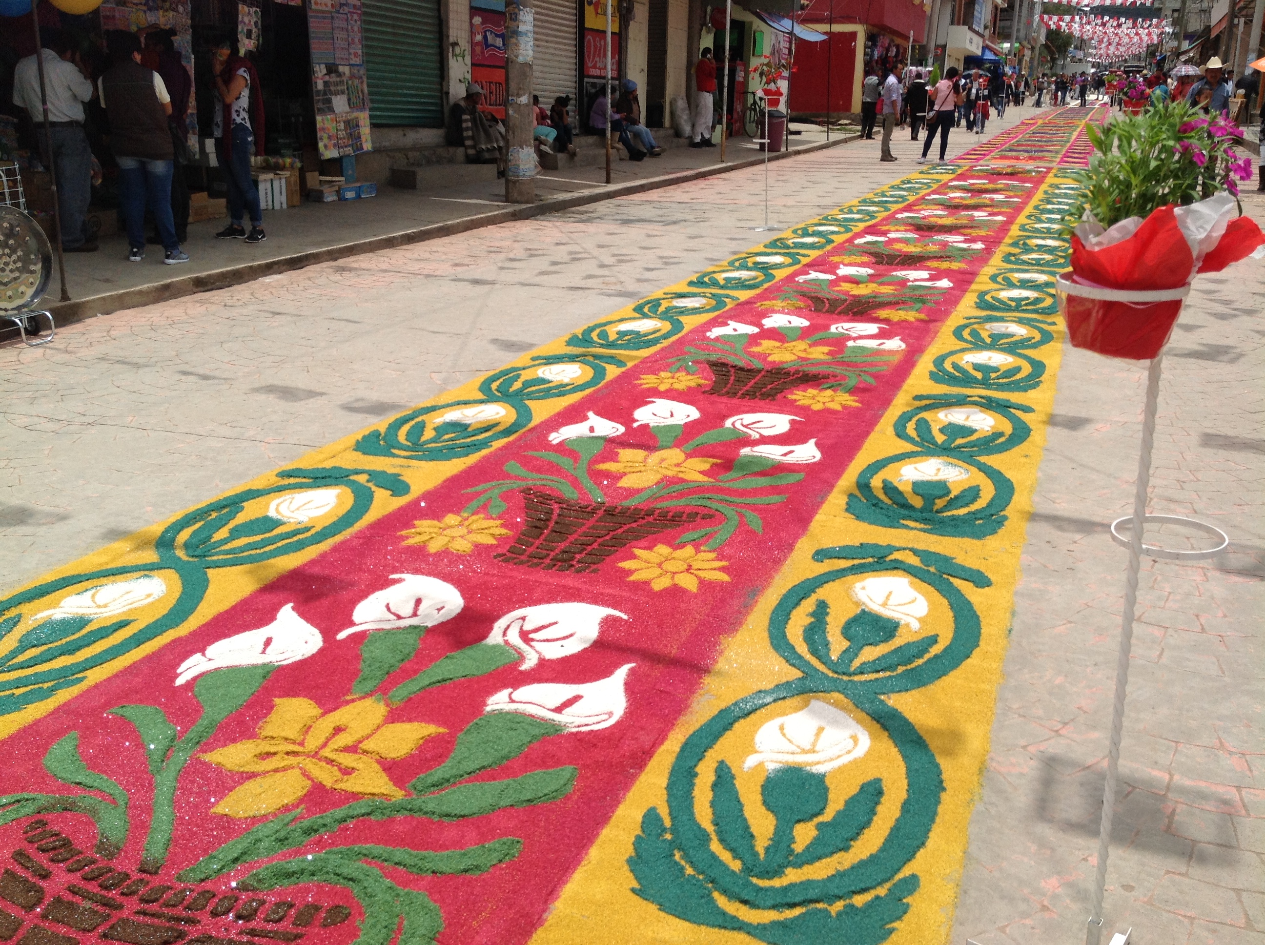 En 1943 surge la idea de realizar los primeros tapetes en las calles, utilizando en ese entonces arena blanca que era esparcida a pulso. Se complementó a este elemento el uso del aserrín, trazando dibujos simples, enmarcando por último los tapetes con macetas de las casas vecinas. En siguientes años, surgirían nuevas ideas que permitirían el desarrollo de los actuales tapetes con sus tradicionales técnicas. Mención especial merece Enedino Torres, quien por años realizó algunos diseños con una técnica que se denominó en punto de cruz, pues se asemejaba a esta técnica del bordado, sin embargo, debido a su complejidad, este estilo desapareció tras su fallecimiento.