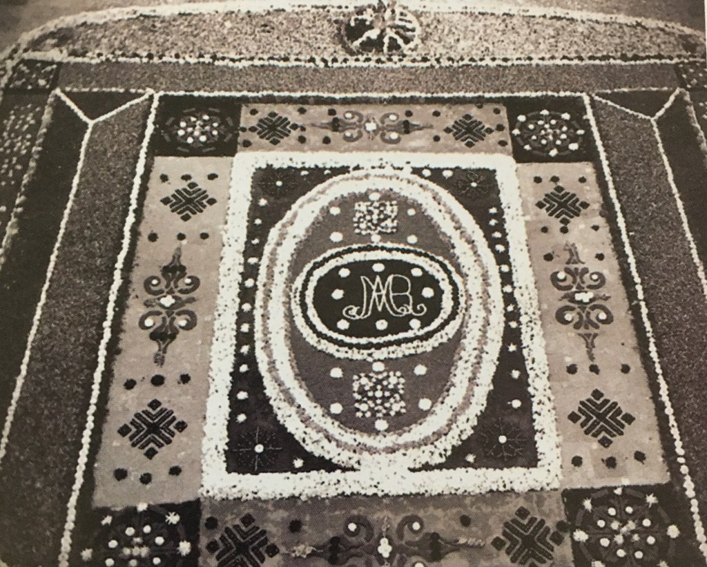 Para 1910, las alfombras se realizaban con flores que se cultivaban en los jardines, las cuales eran donadas con esta finalidad. Por estas fechas se incorpora la idea de realizar en el centro un óvalo que contuviera el monograma de María, esto en palabras de Antonio Méndez Ávila, quien menciona como su padre fue pionero en dicha idea. También era costumbre de aquellos años emplear aserrín para matizar algunos colores, así como el uso de helecho y otros tipos de vegetación como base de la alfombra.