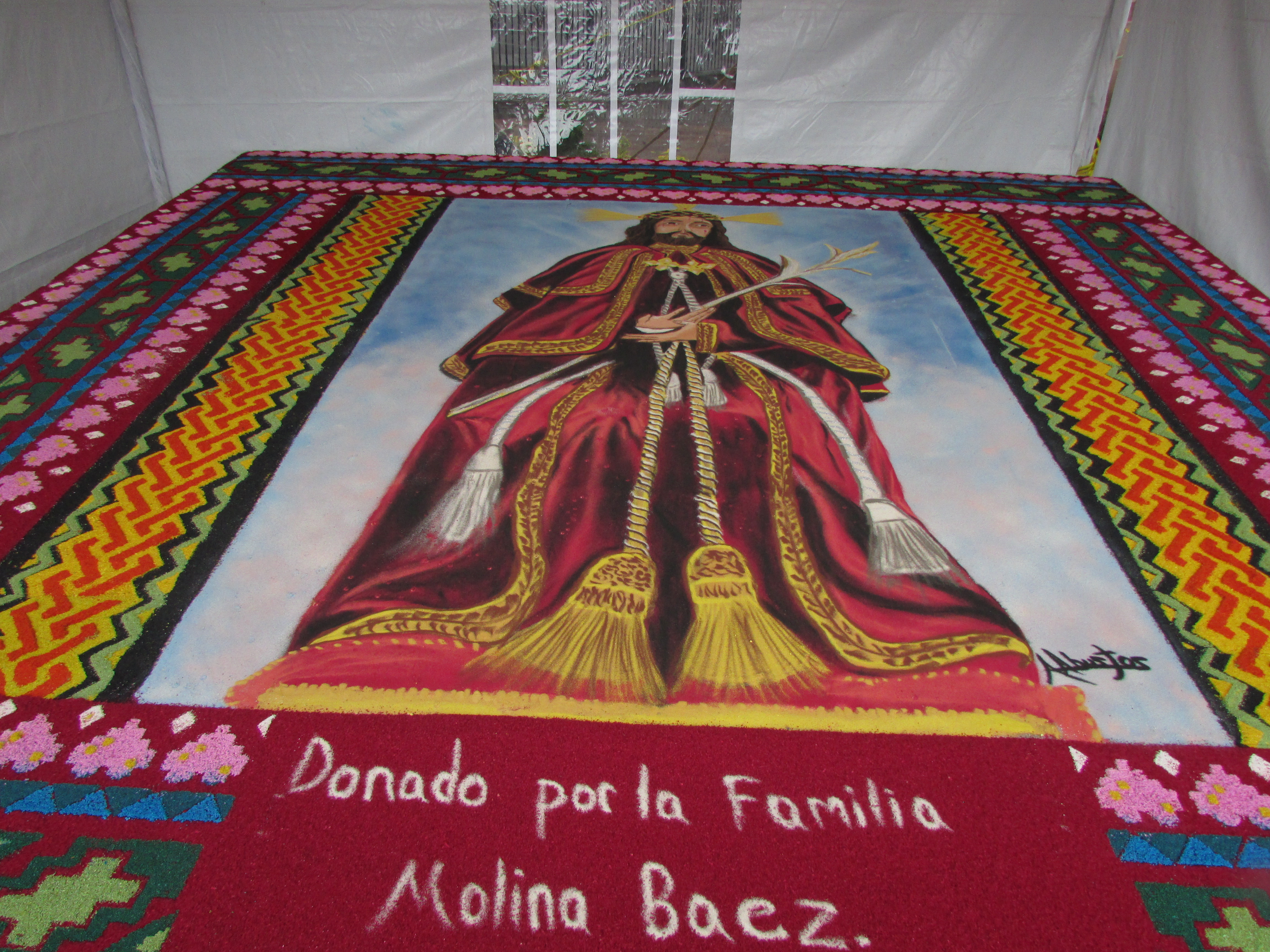 Sería en 1870 cuando otro joven, Apolinar Campeche, realiza un tapete con aserrín coloreado. Desde entonces, también se incorporaría el uso del aserrín, inicialmente en las alfombras. Cabe aclarar, en este punto, que la principal diferencia actual entre las alfombras y los tapetes consiste en que las primeras suelen contener en su centro alguna ilustración religiosa, la cual es enmarcada por flores u otros materiales, siendo realizado además de forma cuadrangular, sirviendo, entre otras razones, meramente para su contemplación, mientras que el tapete habitualmente es elaborado en aserrín, extendiéndose en las calles donde pasará la procesión, por lo que su destino es el ser destruido por las pisadas de los participantes de la procesión.